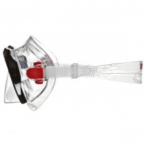 Helder glas, zwart frame en snorkel mer rode contrasten.
